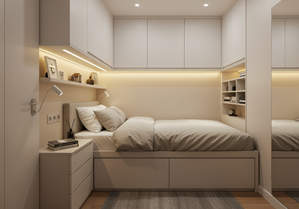 Dobrze przemyślana kolorystyka i rozmieszczenie oświetlenia wprowadzają w małej sypialni równowagę wizualną i wspierają ergonomię codziennego użytkowania.
